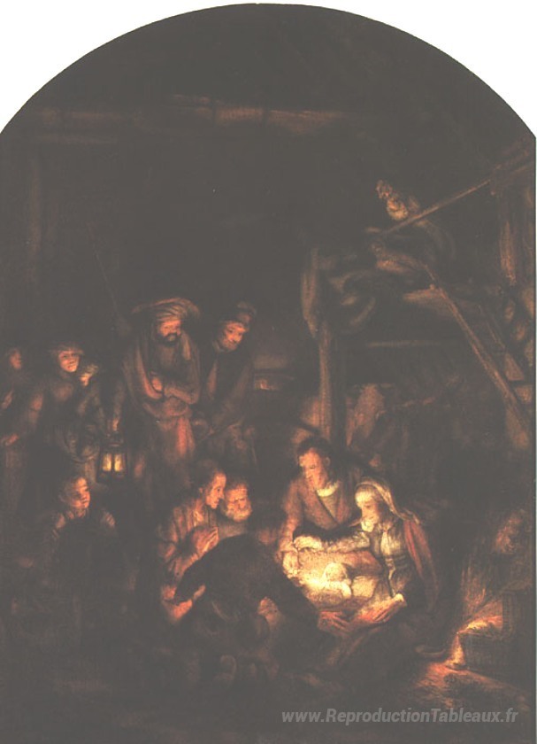 Nous vous proposons une reproduction artisanale sur toile du célèbre tableau 'L'adoration des bergers (fragment)' de Rembrandt, provenant du Musée de la Reproduction.