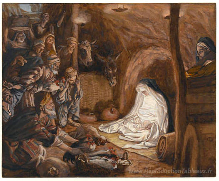 Nous vous proposons une reproduction artisanale sur toile du célèbre tableau 'L'adoration des bergers, illustration pour «la vie du Christ»' de James Tissot, provenant du Musée de la Reproduction.