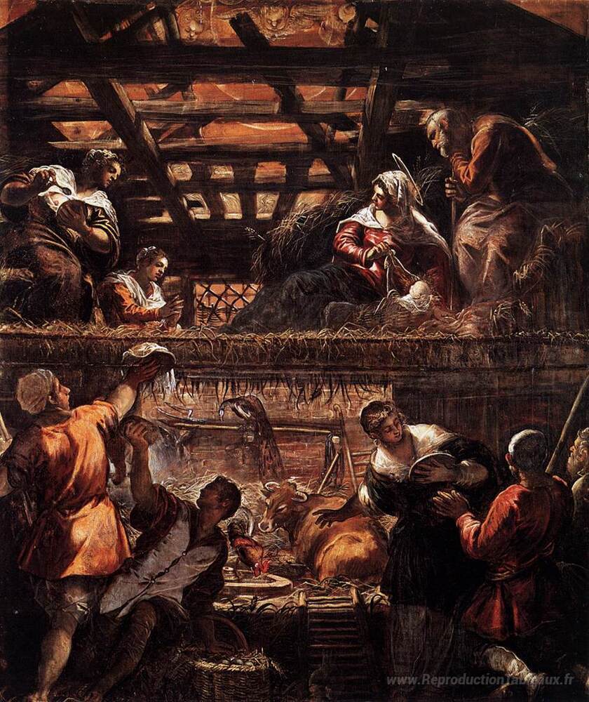 Nous vous proposons une reproduction artisanale sur toile du célèbre tableau 'L'adoration des bergers' de Tintoretto, provenant du Musée de la Reproduction.