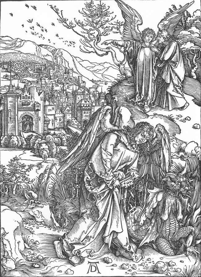 Nous vous proposons une reproduction artisanale sur toile du célèbre tableau 'L'ange avec la clé de la fosse sans fond' de Albrecht Durer, provenant du Musée de la Reproduction.