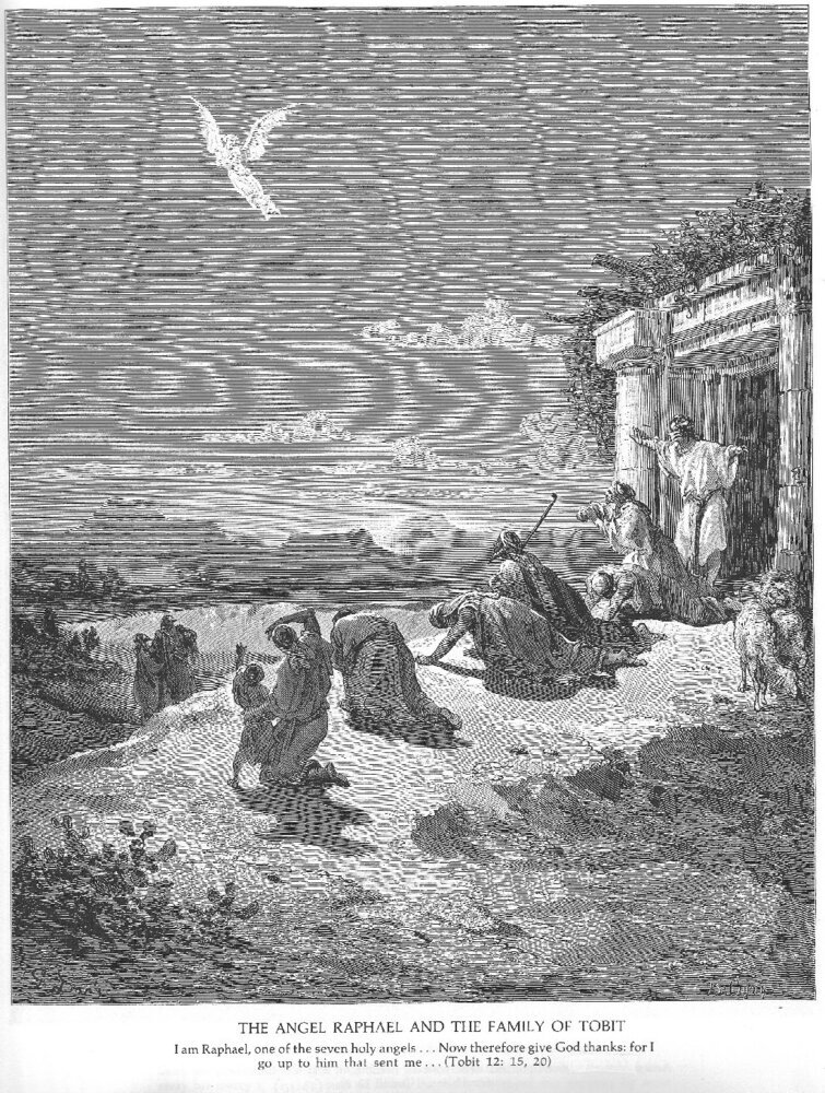 Nous vous proposons une reproduction artisanale sur toile du célèbre tableau 'L'ange Raphael et la famille de Tobit' de Gustave Dore, provenant du Musée de la Reproduction.