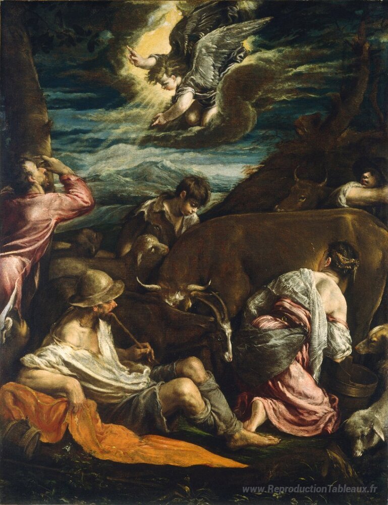 Nous vous proposons une reproduction artisanale sur toile du célèbre tableau 'L'annonciation aux bergers' de Jacopo Bassano, provenant du Musée de la Reproduction.