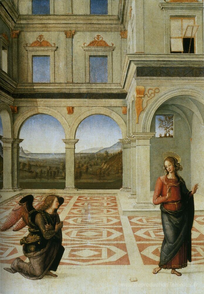 Nous vous proposons une reproduction artisanale sur toile du célèbre tableau 'L'Annonciation' de Pietro Perugino, provenant du Musée de la Reproduction.