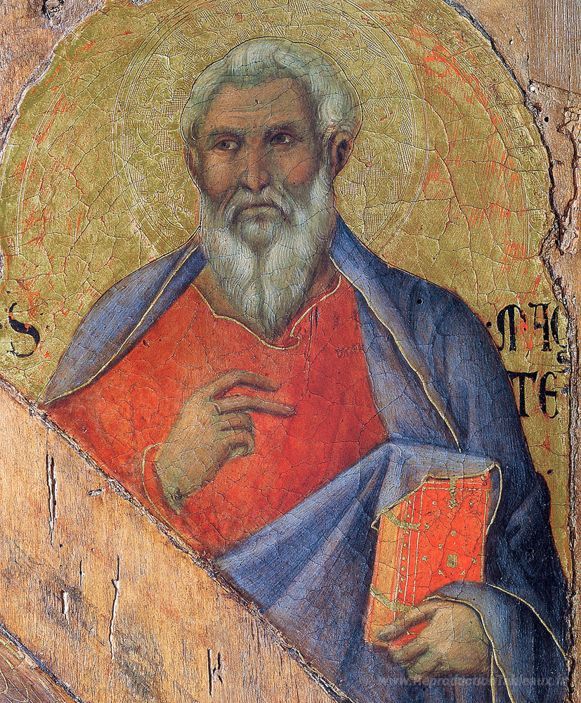 Nous vous proposons une reproduction artisanale sur toile du célèbre tableau 'L'apôtre Matthew' de Duccio, provenant du Musée de la Reproduction.