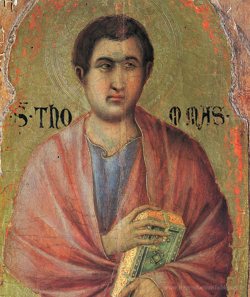 Nous vous proposons une reproduction artisanale sur toile du célèbre tableau 'L'apôtre Thomas' de Duccio, provenant du Musée de la Reproduction.
