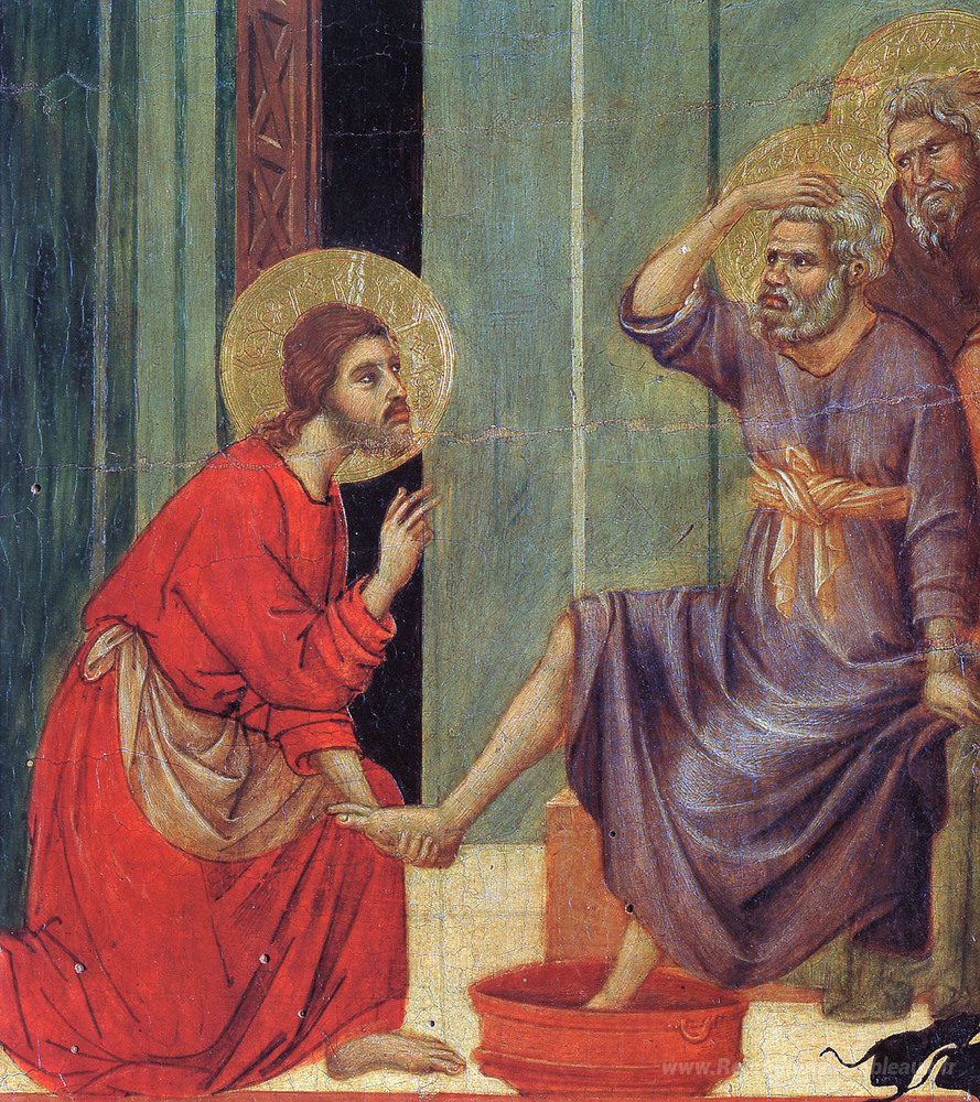 Nous vous proposons une reproduction artisanale sur toile du célèbre tableau 'Lavage des pieds (fragment)' de Duccio, provenant du Musée de la Reproduction.