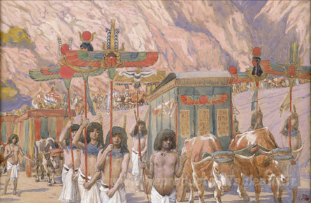 Nous vous proposons une reproduction artisanale sur toile du célèbre tableau 'Le corps de Jacob est emmené à Canaan' de James Tissot, provenant du Musée de la Reproduction.