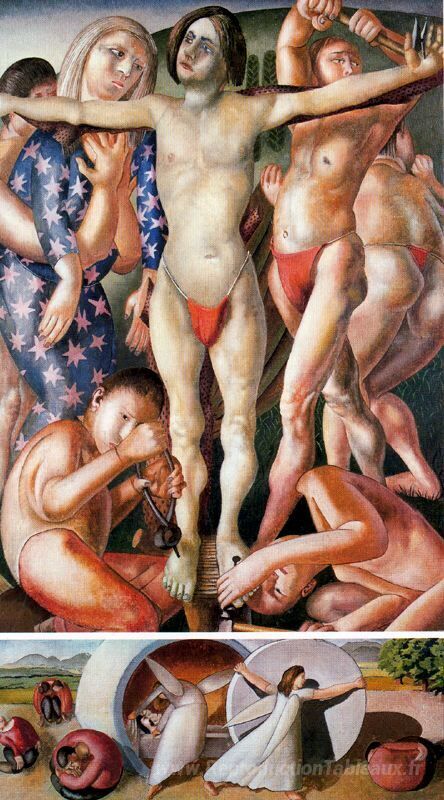 Nous vous proposons une reproduction artisanale sur toile du célèbre tableau 'Le dépôt et le roulement de la pierre' de Stanley Spencer, provenant du Musée de la Reproduction.