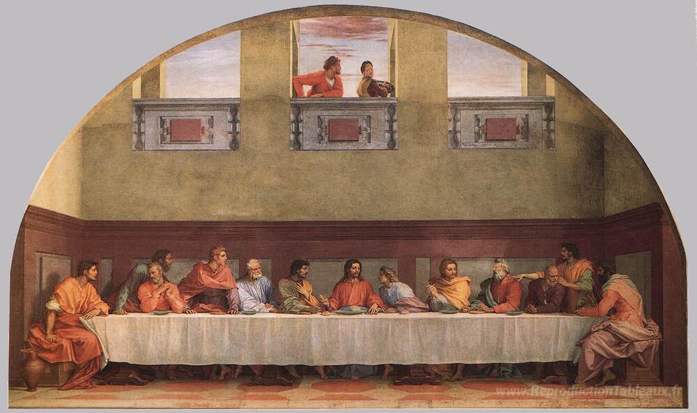 Nous vous proposons une reproduction artisanale sur toile du célèbre tableau 'Le dernier souper (détail)' de Andrea del Sarto, provenant du Musée de la Reproduction.