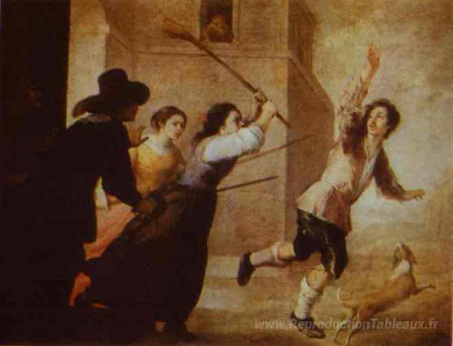 Nous vous proposons une reproduction artisanale sur toile du célèbre tableau 'Le fils prodigue a chassé' de Bartolome Esteban Murillo, provenant du Musée de la Reproduction.