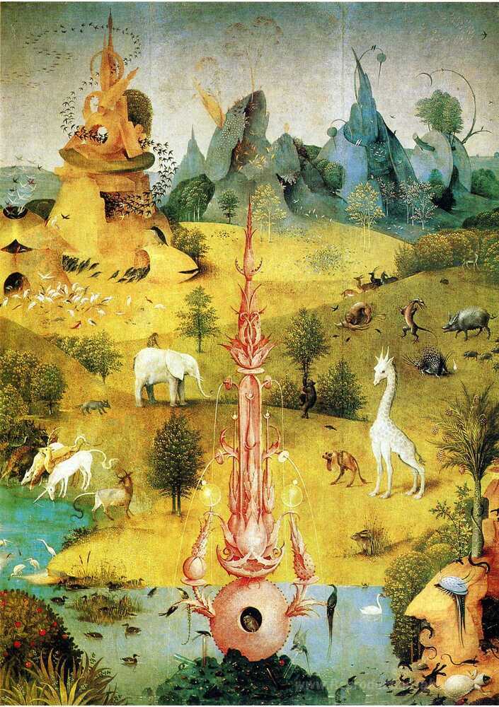 Nous vous proposons une reproduction artisanale sur toile du célèbre tableau 'Le Garden of Earthly Delights (détail)' de Hieronymus Bosch, provenant du Musée de la Reproduction.