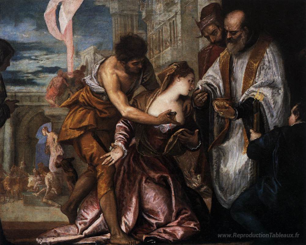 Nous vous proposons une reproduction artisanale sur toile du célèbre tableau 'Le martyre et la dernière communion de Saint Lucy' de Paolo Veronese, provenant du Musée de la Reproduction.