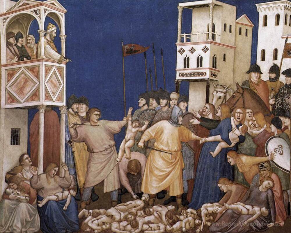 Nous vous proposons une reproduction artisanale sur toile du célèbre tableau 'Le massacre des innocents' de Giotto, provenant du Musée de la Reproduction.