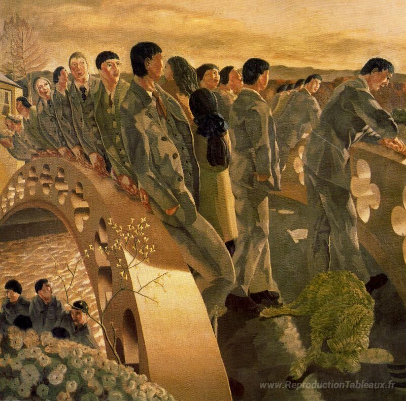 Nous vous proposons une reproduction artisanale sur toile du célèbre tableau 'Le pont' de Stanley Spencer, provenant du Musée de la Reproduction.