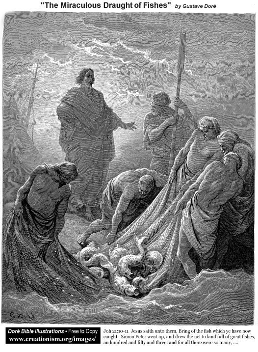 Nous vous proposons une reproduction artisanale sur toile du célèbre tableau 'Le projet miraculeux de poissons' de Gustave Dore, provenant du Musée de la Reproduction.