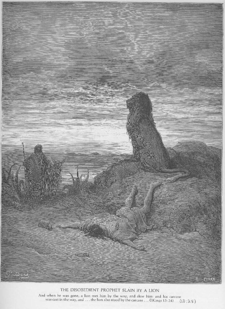 Nous vous proposons une reproduction artisanale sur toile du célèbre tableau 'Le prophète désobéissant est tué par un lion' de Gustave Dore, provenant du Musée de la Reproduction.