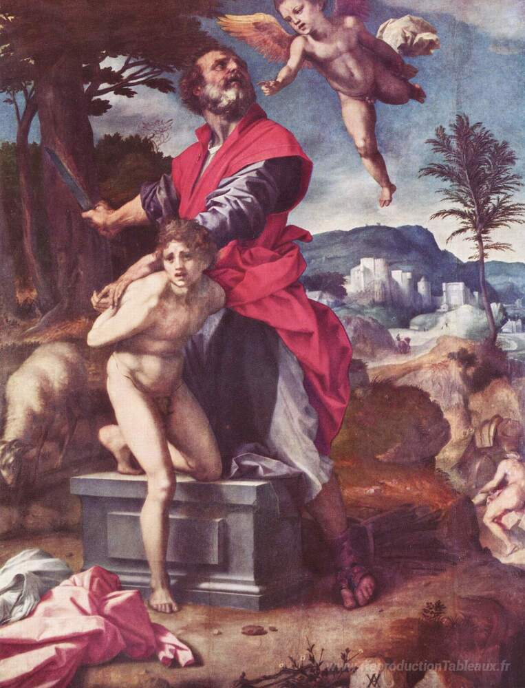 Nous vous proposons une reproduction artisanale sur toile du célèbre tableau 'Le sacrifice d'Abraham' de Andrea del Sarto, provenant du Musée de la Reproduction.