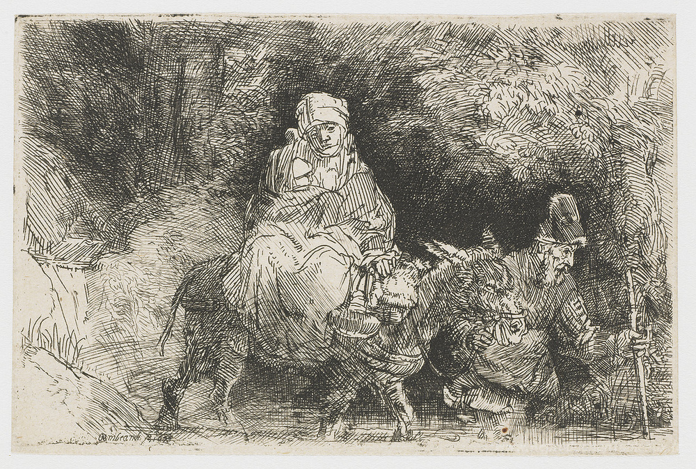 Nous vous proposons une reproduction artisanale sur toile du célèbre tableau 'Le vol en Égypte traversant un ruisseau' de Rembrandt, provenant du Musée de la Reproduction.