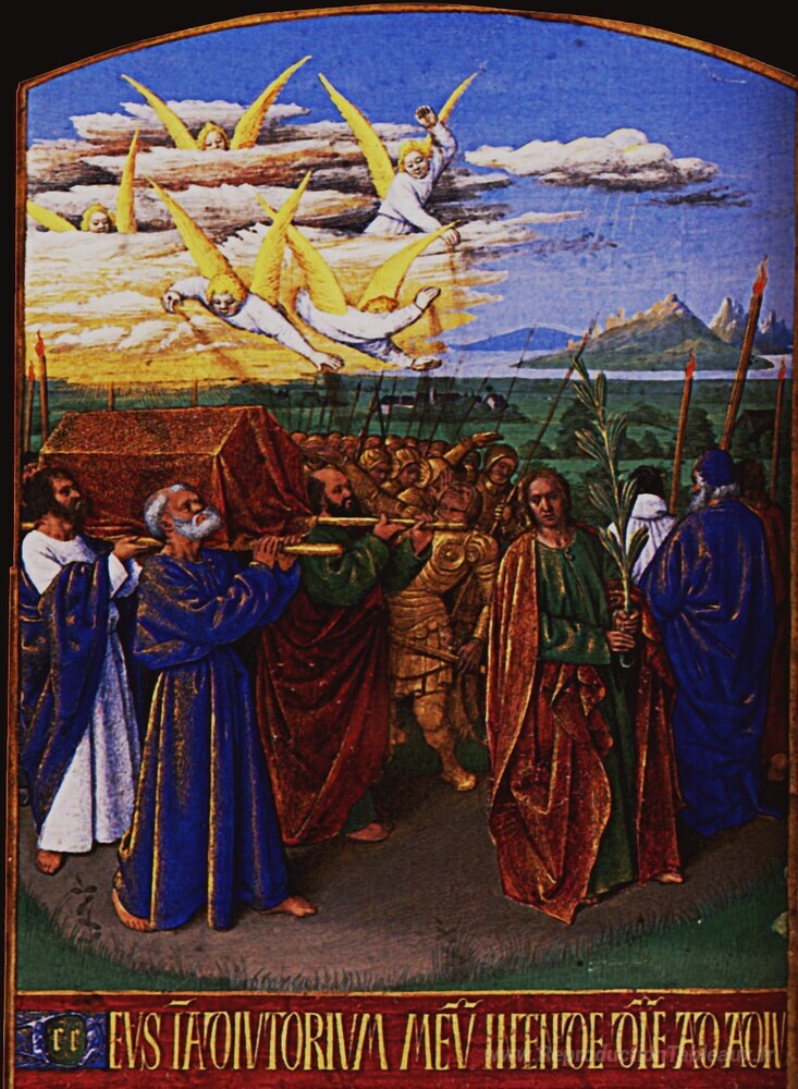 Nous vous proposons une reproduction artisanale sur toile du célèbre tableau 'Les funérailles de la Vierge' de Jean Fouquet, provenant du Musée de la Reproduction.