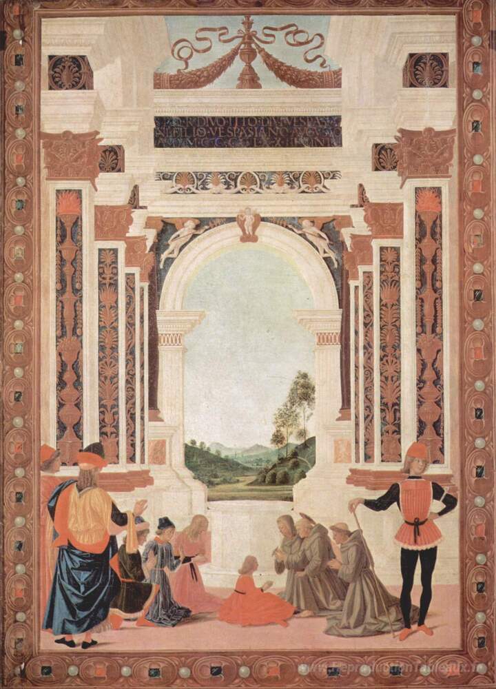 Nous vous proposons une reproduction artisanale sur toile du célèbre tableau 'Les miracles de San Bernardino. La guérison d'un jeune' de Pietro Perugino, provenant du Musée de la Reproduction.