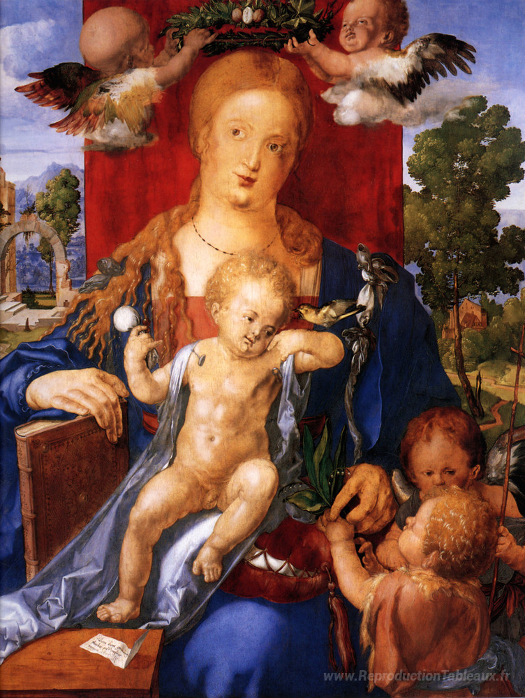 Nous vous proposons une reproduction artisanale sur toile du célèbre tableau 'Madonna avec le siskin' de Albrecht Durer, provenant du Musée de la Reproduction.