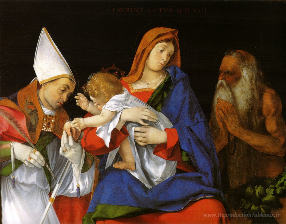 Nous vous proposons une reproduction artisanale sur toile du célèbre tableau 'Madonna avec un évêque et Saint-Onuphrius' de Lorenzo Lotto, provenant du Musée de la Reproduction.