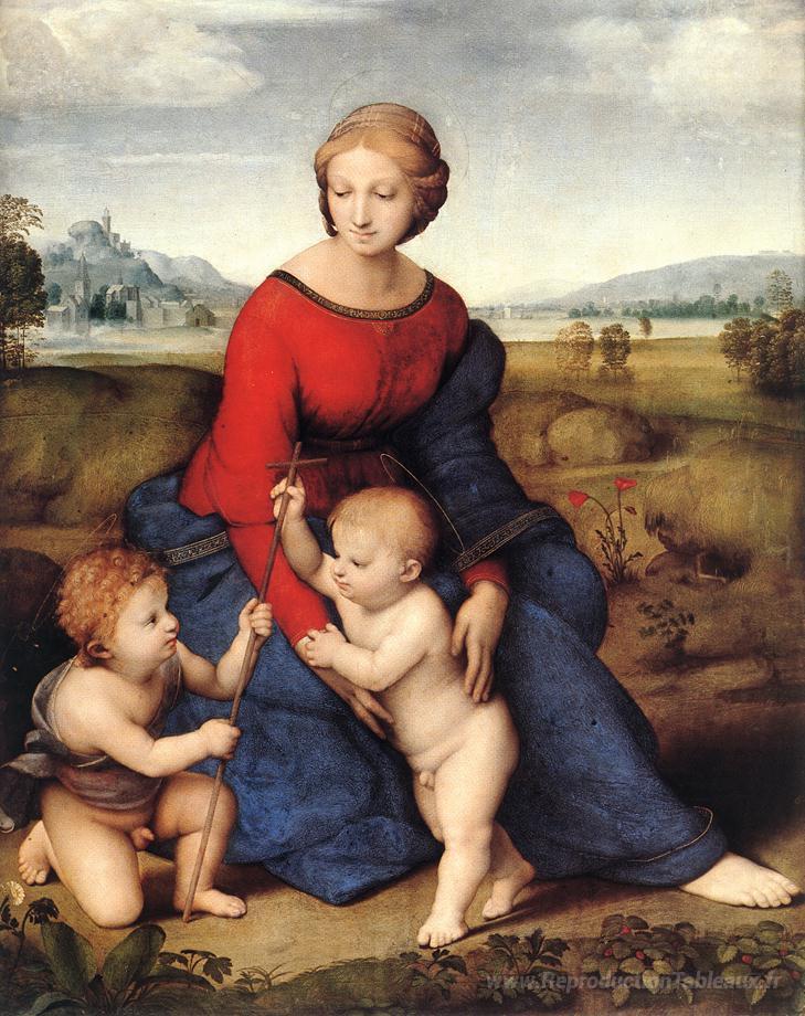 Nous vous proposons une reproduction artisanale sur toile du célèbre tableau 'Madonna dans la prairie' de Raphael, provenant du Musée de la Reproduction.