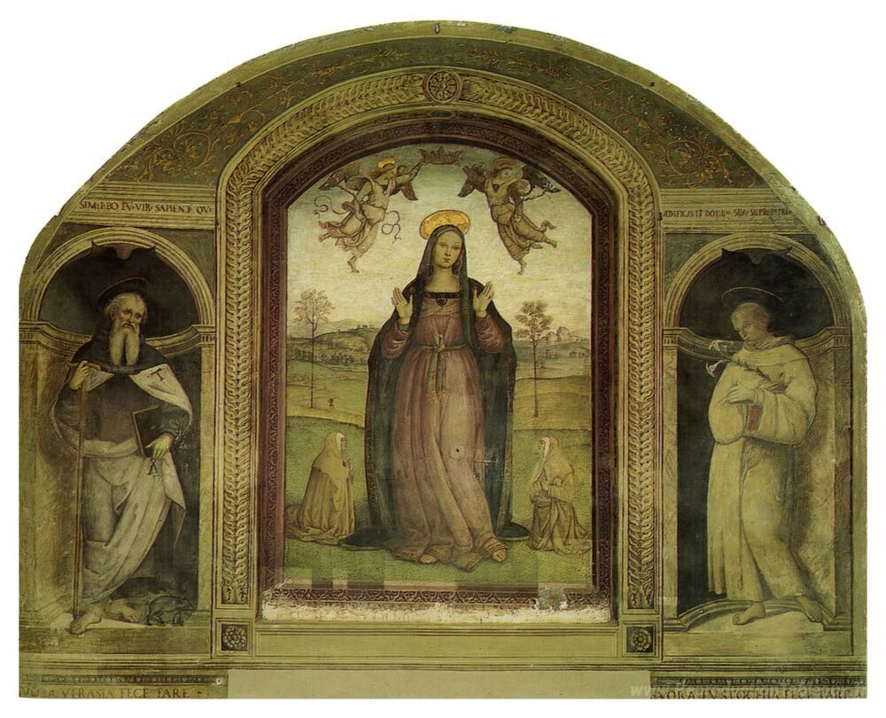 Nous vous proposons une reproduction artisanale sur toile du célèbre tableau 'Madonna delle Grazie' de Pietro Perugino, provenant du Musée de la Reproduction.