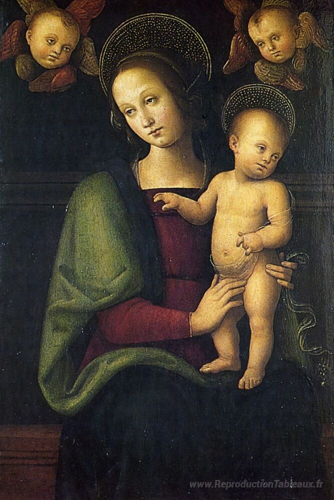 Nous vous proposons une reproduction artisanale sur toile du célèbre tableau 'Madonna et enfant avec deux chérubins' de Pietro Perugino, provenant du Musée de la Reproduction.