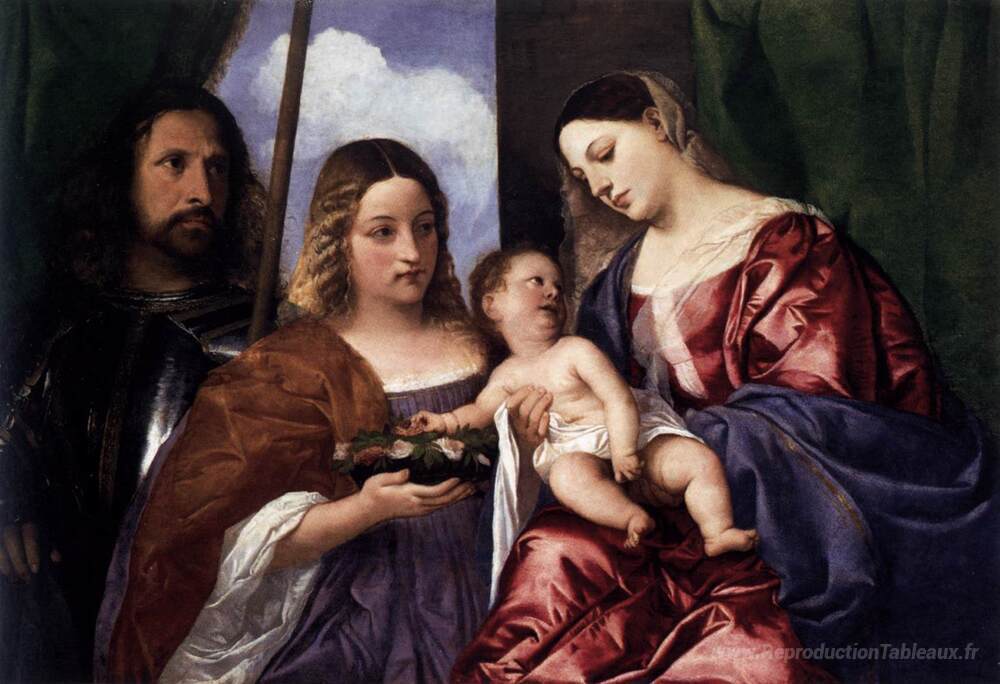 Nous vous proposons une reproduction artisanale sur toile du célèbre tableau 'Madonna et enfant avec Sts Dorothy et George' de Titian, provenant du Musée de la Reproduction.