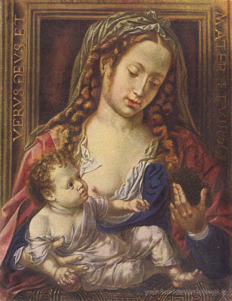 Nous vous proposons une reproduction artisanale sur toile du célèbre tableau 'Madonna et enfant' de Mabuse, provenant du Musée de la Reproduction.