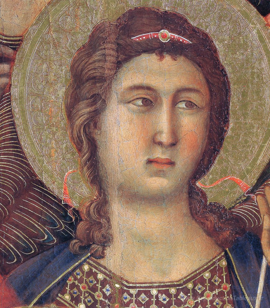 Nous vous proposons une reproduction artisanale sur toile du célèbre tableau 'Madonna et enfant sur un trône (fragment du côté avant)' de Duccio, provenant du Musée de la Reproduction.