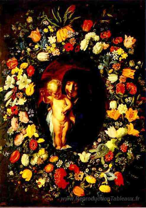 Nous vous proposons une reproduction artisanale sur toile du célèbre tableau 'Madonna et l'enfant enroulées de fleurs' de Jacob Jordaens, provenant du Musée de la Reproduction.