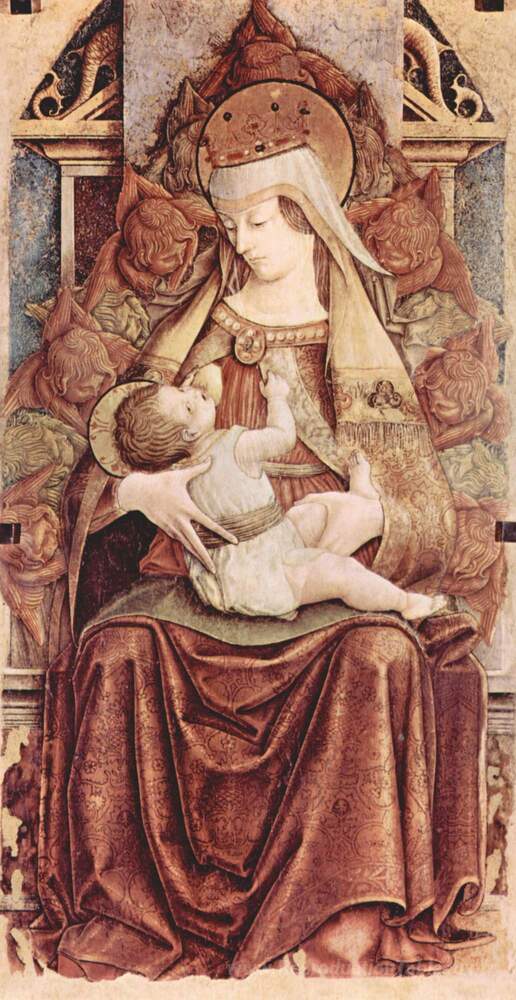 Nous vous proposons une reproduction artisanale sur toile du célèbre tableau 'Madonna intronisée (Maria Lactans intronisée)' de Carlo Crivelli, provenant du Musée de la Reproduction.