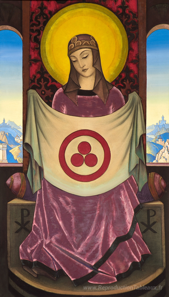 Nous vous proposons une reproduction artisanale sur toile du célèbre tableau 'Madonna Oriflamma' de Nicholas Roerich, provenant du Musée de la Reproduction.