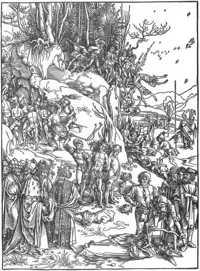 Nous vous proposons une reproduction artisanale sur toile du célèbre tableau 'Martyre des dix mille' de Albrecht Durer, provenant du Musée de la Reproduction.