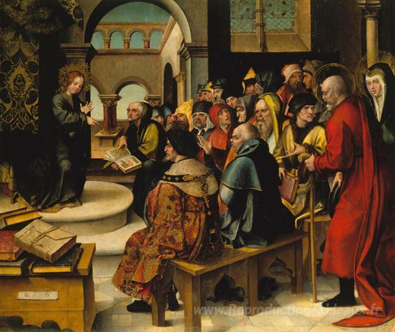 Nous vous proposons une reproduction artisanale sur toile du célèbre tableau 'Menino Jésus Entre OS Doutores' de Cristovao de Figueiredo, provenant du Musée de la Reproduction.