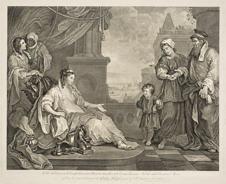 Nous vous proposons une reproduction artisanale sur toile du célèbre tableau 'Moïse a apporté à la fille du pharaon' de William Hogarth, provenant du Musée de la Reproduction.