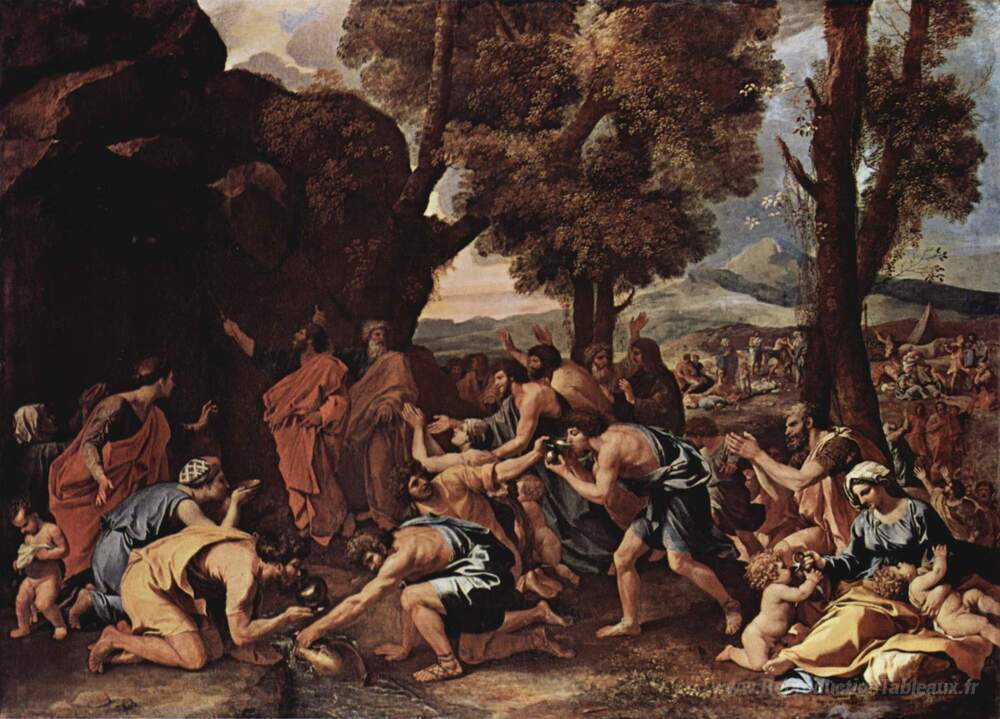 Nous vous proposons une reproduction artisanale sur toile du célèbre tableau 'Moïse frappant l'eau de la roche' de Nicolas Poussin, provenant du Musée de la Reproduction.