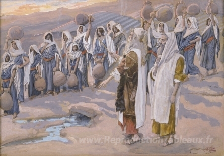 Nous vous proposons une reproduction artisanale sur toile du célèbre tableau 'Moïse frappe le rocher dans le désert' de James Tissot, provenant du Musée de la Reproduction.