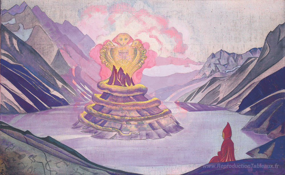 Nous vous proposons une reproduction artisanale sur toile du célèbre tableau 'Nagarjuna, conquérant du serpent' de Nicholas Roerich, provenant du Musée de la Reproduction.