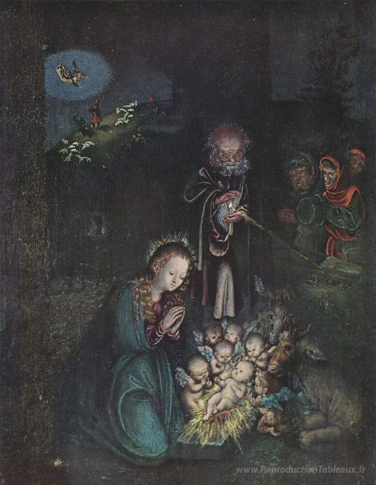 Nous vous proposons une reproduction artisanale sur toile du célèbre tableau 'Nativité (nuit sainte, Noël)' de Lucas Cranach the Elder, provenant du Musée de la Reproduction.