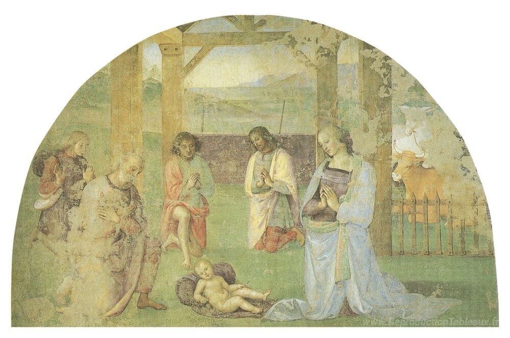 Nous vous proposons une reproduction artisanale sur toile du célèbre tableau 'Nativité' de Pietro Perugino, provenant du Musée de la Reproduction.