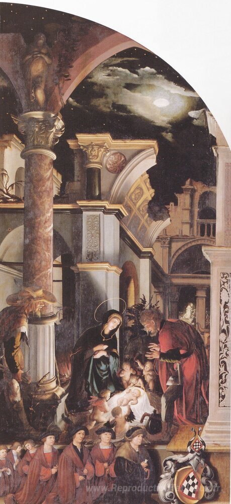 Nous vous proposons une reproduction artisanale sur toile du célèbre tableau 'Oberried retalpiece, aile intérieure droite - La naissance du Ch' de Hans Holbein the Younger, provenant du Musée de la Reproduction.
