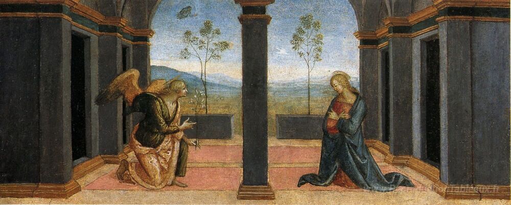 Nous vous proposons une reproduction artisanale sur toile du célèbre tableau 'Pala di Corciano (Annonciation)' de Pietro Perugino, provenant du Musée de la Reproduction.