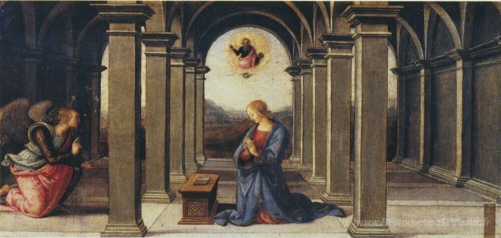 Nous vous proposons une reproduction artisanale sur toile du célèbre tableau 'Pala di Fano (Annonciation)' de Pietro Perugino, provenant du Musée de la Reproduction.