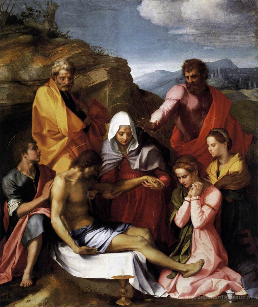 Nous vous proposons une reproduction artisanale sur toile du célèbre tableau 'Pietà avec des saints' de Andrea del Sarto, provenant du Musée de la Reproduction.