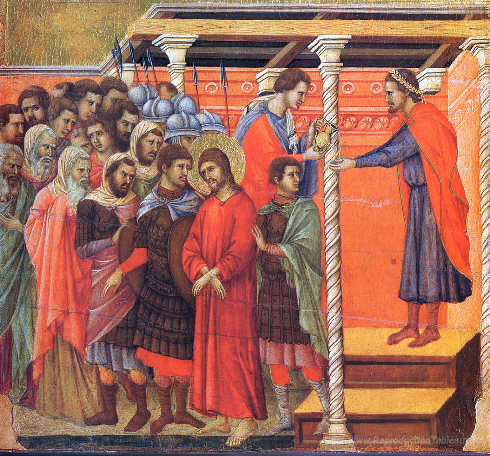 Nous vous proposons une reproduction artisanale sur toile du célèbre tableau 'Pilate se lave les mains' de Duccio, provenant du Musée de la Reproduction.