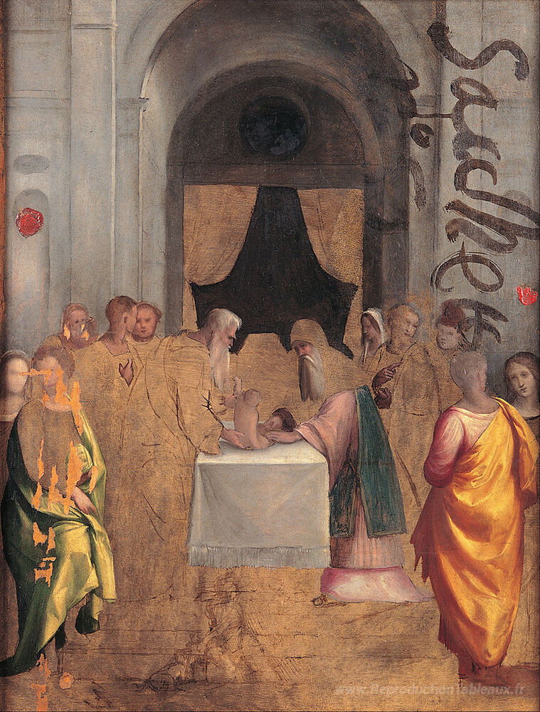 Nous vous proposons une reproduction artisanale sur toile du célèbre tableau 'Présentation au temple' de Benvenuto Tisi, provenant du Musée de la Reproduction.
