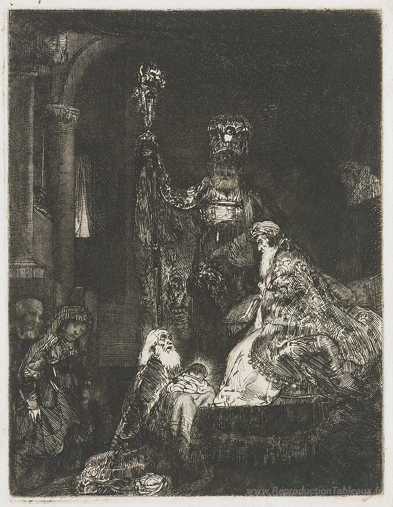 Nous vous proposons une reproduction artisanale sur toile du célèbre tableau 'Présentation dans le temple' de Rembrandt, provenant du Musée de la Reproduction.